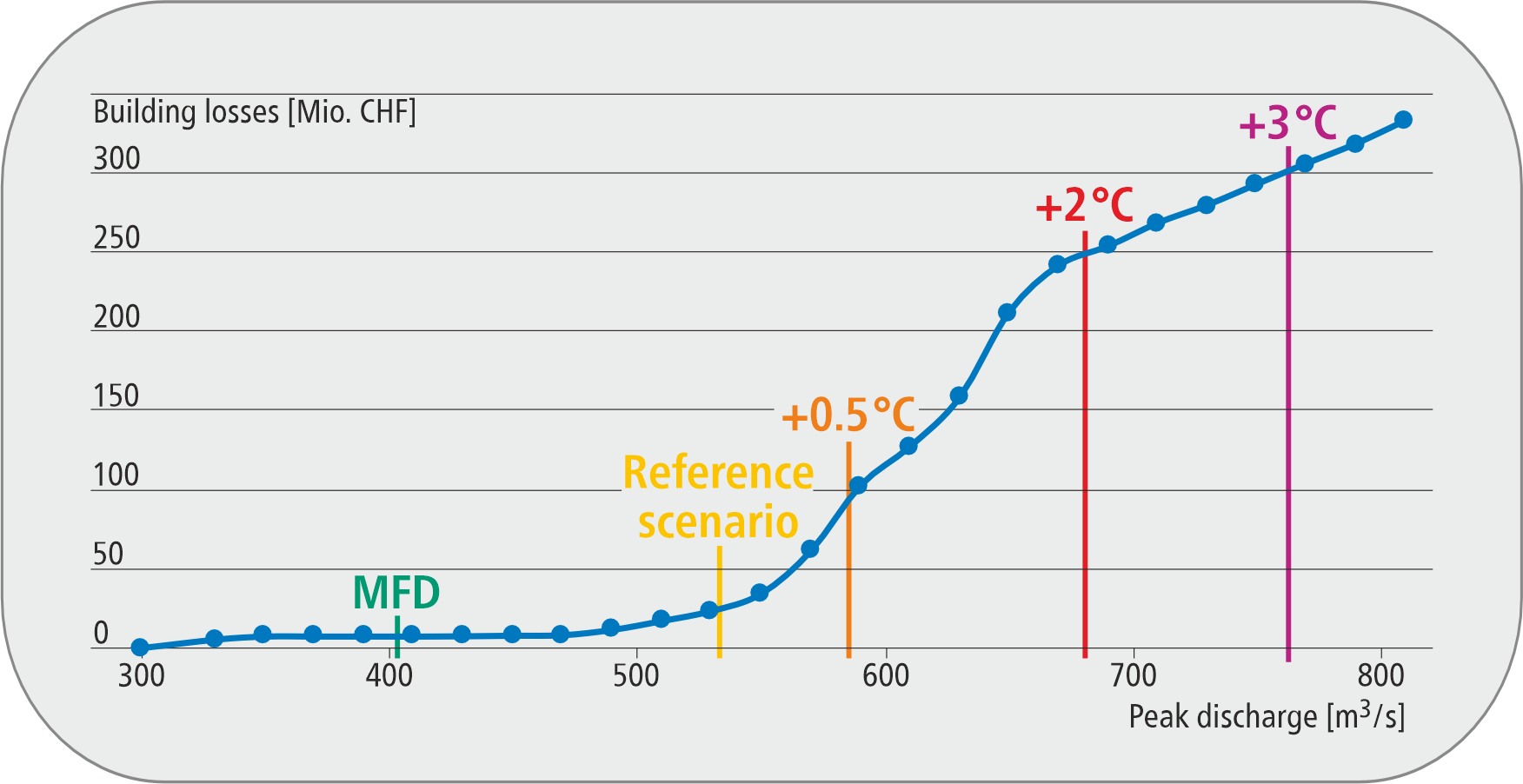The visualisation shows that moderate increases in precipitation levels due to climate change are already leading to significantly higher losses owing to extreme flooding. The visualisation is intended to help decision makers, specialists in natural hazards, engineers and operators of critical infrastructure to develop an awareness of the intensity and consequences of extreme flooding events – both today and in an even warmer climate.